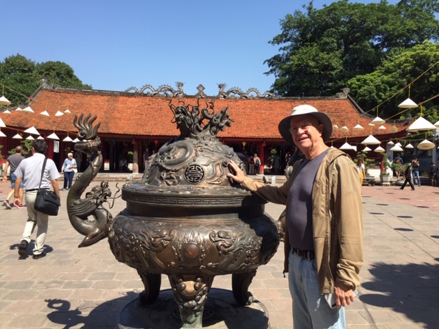 The Temple of Literature is one of the oldest in the area, and well maintained inside.  Our next stop was The Vietnam Museum of Fine Arts.  Only Vietnamese paintings, very dark.  But the sculptures were fine.  Nearby was the Military Museum, so we walked there via Lenin Square only to discover that the museum is closed on Fridays.  We’ll try tomorrow.  Instead we stopped for a coffee at a park serving coffee and sweet drinks.  Tom had an Americano, and I had a peach tea, costing $1 total.