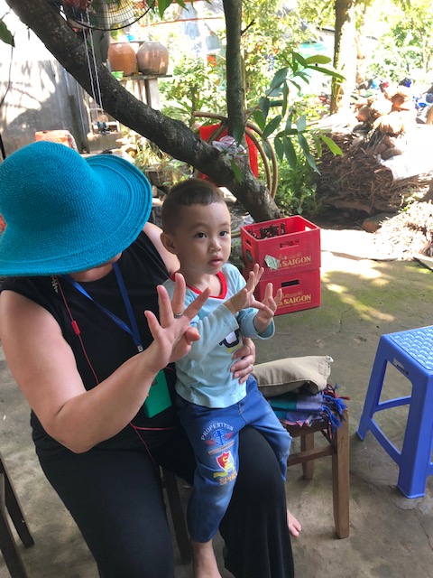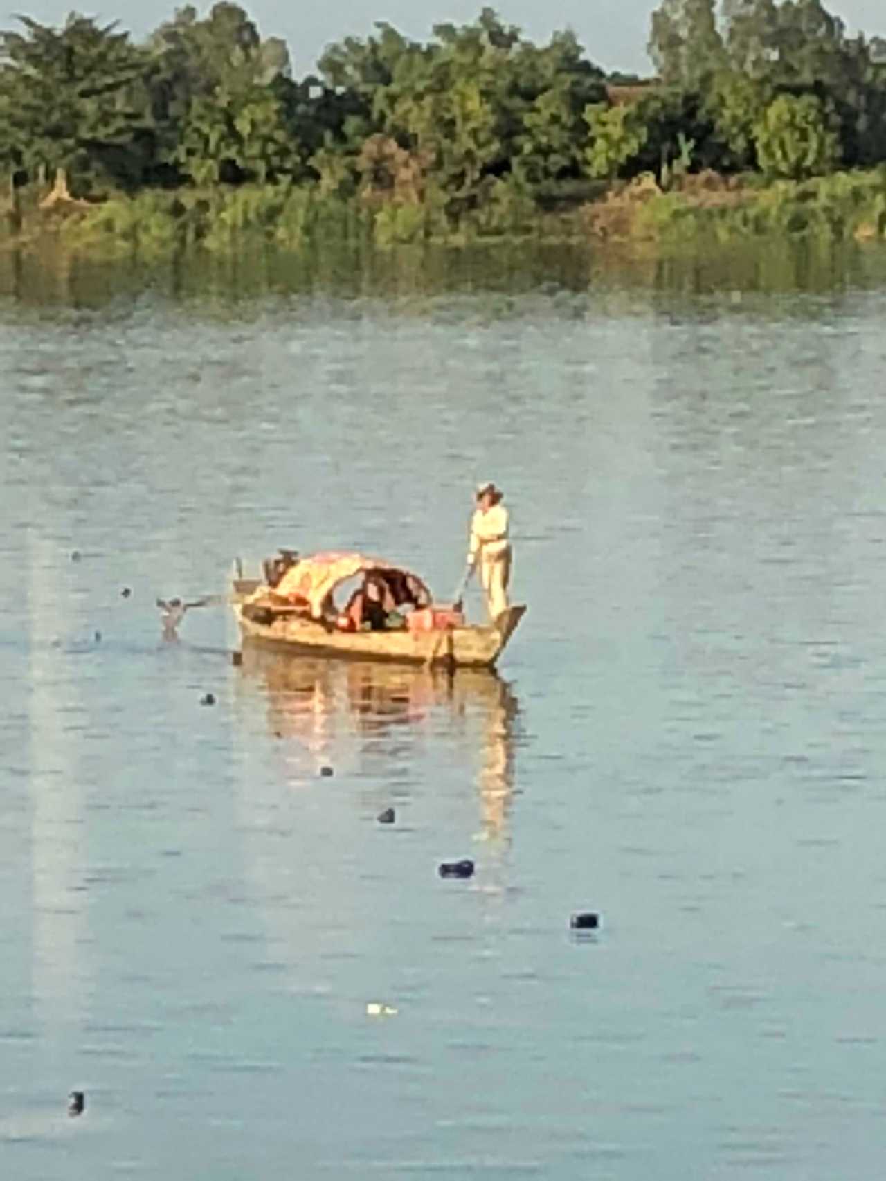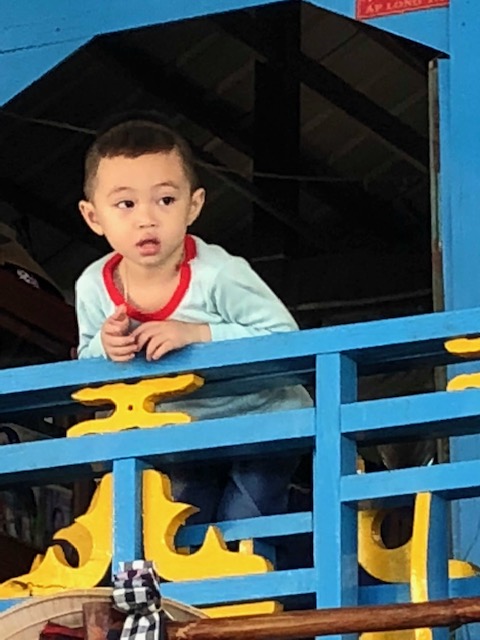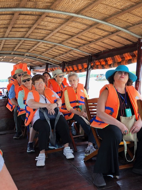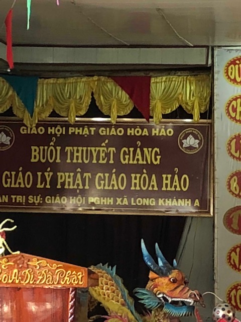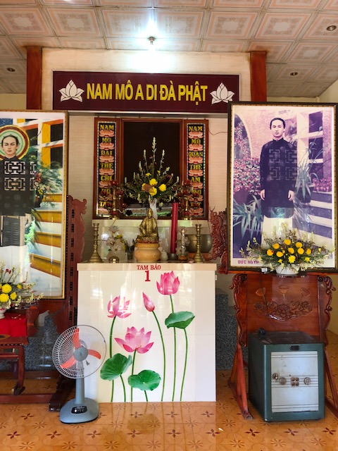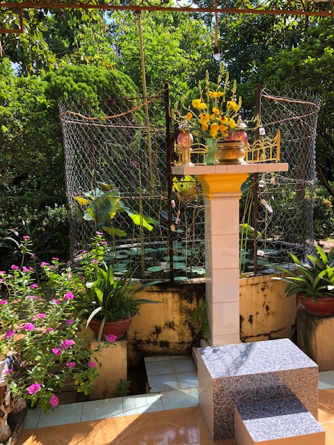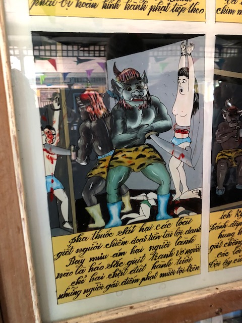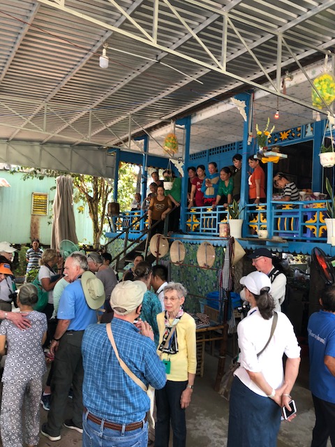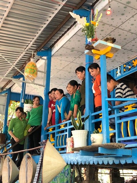 This is our last day in Vietnam, and we started it with a tour of Long Khanh Island at 8:30 am. A friend was saying that our tours seemed to start very early, but it’s much better to start early than to start when it’s in the 90s in the afternoon. We come back drenched at 10 am as it is; we might not come back at all if we waited until noon to go out. On the outside of the island is a disappearing island that only appears during the dry season and has a short growing season (now). Short crops and fish farms are grown on it. Before communism, families owned specific plots and passed them along to their children. Now, the local government passes the plots along to those who need the income the most. (So we’re told.) We walked through the village and saw most homes on stilts and most graves raised several feet because the water comes up quite high during rainy season. Most of the people on the island belong to the Hoa Hao Buddhist religion, which was started by a young monk who disappeared, but whose belief was all about helping people. (They also have some illustrations on the wall of the results of bad karma.) They are primarily vegan, but might raise goats or sell eggs or milk to make money for the temple. We visited the local temple that is dedicated to him. The Hoa Hao sect is one of the largest growing Buddhist sects. Along the way, we saw a moving market – a cart with vegetables that is moved from place to place for people who didn’t make it to the large market.