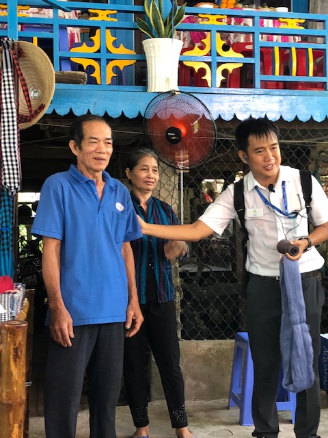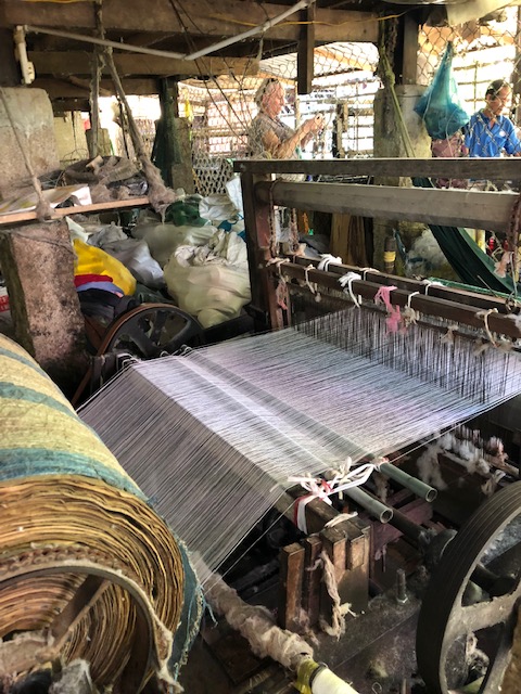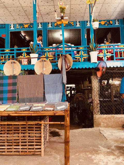 Our final destination was a family that ran some weaving looms. There are 70 families on the island that are involved in the production of scarves. The thread (60% cotton and 40% synthetic) is imported from Hanoi, then pulled into skeins, then covered with rice powder, then dyed with local colors, then prepared for the looms, then woven into scarves. The patterns started as traditional Khmer patterns and colors, but have branched out. They had two sizes available for $3 and $7 to us, but wholesale most to markets and fashion houses. The father has two daughters who want nothing to do with the business, but is excited to have a 21-year old son who is willing to stay on the island and continue it. There are only tourists about twice a week on this island, so a lot of the locals were there to see us. We were their entertainment for the week, and we definitely helped their daily economy.