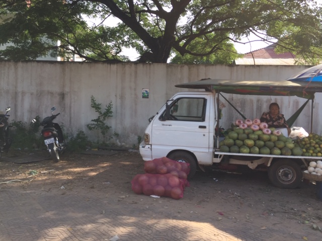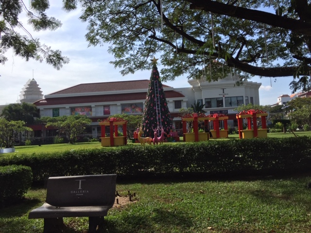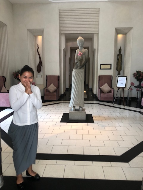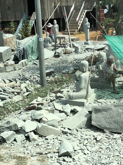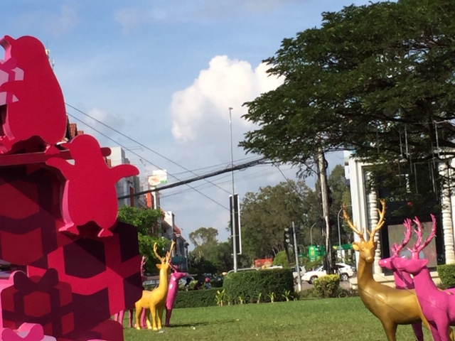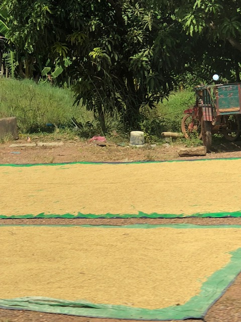 Today was mainly a travel day with the bus leaving the ship at 8 am heading for a 4+ hour drive to Siem Reap. Along the way, we stopped at a rubber plantation to see how they pull the sap out of a rubber tree. We also passed a small town where all the businesses seemed to be stone carvers, but the stone was imported from another part of the country. There were several homes that were drying rice on the front yards (see photo below). There were also several roadside stands selling fruit and vegetables. Don’t ask why the Christmas tree and reindeer at one resort! We checked into the beautiful Park Hyatt Siem Reap hotel with the rest of the day on our own. A few people went to see some temples, while most went to the Angkor National Museum. Unfortunately, they wouldn’t let us take photos in the museum. Home for a quiet meal at the hotel.