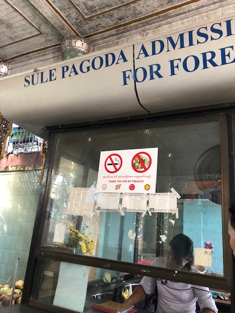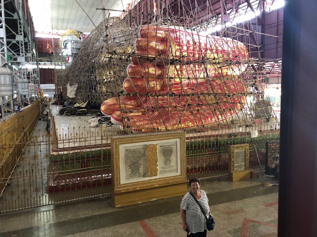 After the market, we walked to the Sule Pagoda, which was quite beautiful with the shiny gold covering, and Tom rang the bell to summon the spirits. I think he summoned the wrong spirits because it went downhill for the rest of the day. The two main sites of Yangon turned out to be under construction. First, we went to the giant reclining Buddha, only to find it being re-gilded, with the first step being painted in black and covered in bamboo scaffolding. You can see they completed the bottom of the feet. That’s me at the end of the feet. Our last stop was Shwedagon Pagoda, the pride of Yangon, but the main spire was under construction and covered with bamboo, so we couldn’t see the gold leaf (or gold tiles) that would be covering it. Did our luck wear out?