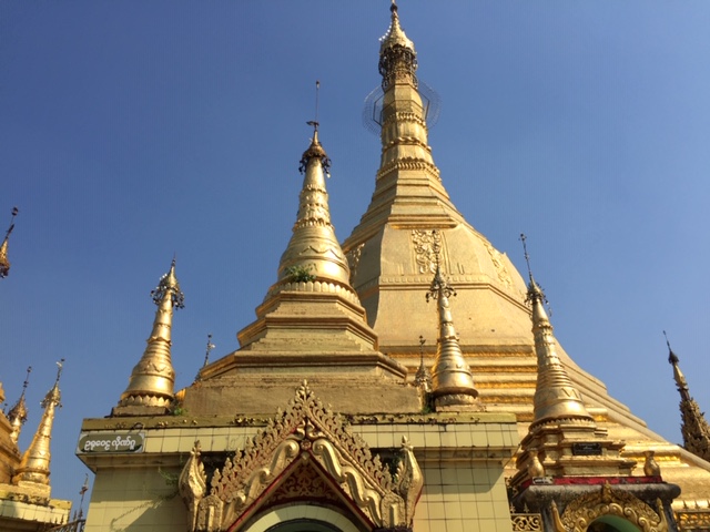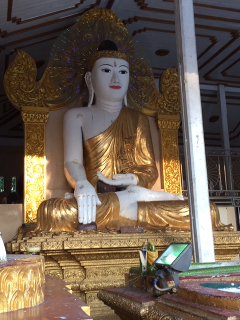 We stayed in Yangon at the Sule Shangri-La, an excellent hotel next to the Sule Pagoda, a beautiful golden stupa within walking distance. The first photo below is from our hotel, but our view isn’t of the Sule Pagoda, it’s the Shwedagon Pagoda, the most famous in Yangon. It’s on a hill, and no other building is supposed to be taller than the Shwedagon. The term “pagoda” was defined a few times by our guides (each time differently), but can mean stupa (solid structure, usually for burial or remains) or temple/shrine (open structure). We added the wedding photo because of two things. Most of the weddings look very Western, and wedding photos are often staged in different hotels or venues before the actual wedding. We saw this throughout Asia. Our Cambodia guide showed us 5 or 6 different outfits for his wedding.
