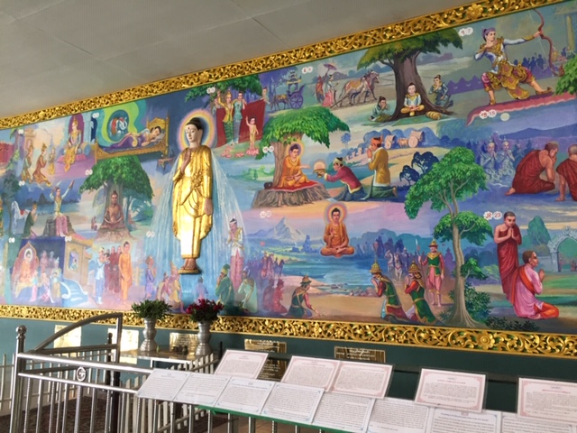 We didn’t do anything the first day, since Tom was recovering from a cough and I was recovering from the heat, but we met our guide, Tin, in the morning to walk through a local market and a Chinese temple The picture of the chicken parts was interesting – there was no part of the chicken that was missing (head, feat, heart, etc.). There were three things immediately different about Yangon from other cities we’ve visited. We saw almost no bikes or motorcycles, but saw thousands of (mainly) white cars (they don’t get dirty as easily). Almost every woman had a very noticeably light pancake makeup in patches on her cheeks and forehead to keep her skin light. Some men did too. Many men, including our guide, wore longhi skirts. Most women wear them too. He says they’re much cooler in the hot weather. Sometimes men wear something under them; sometimes not.