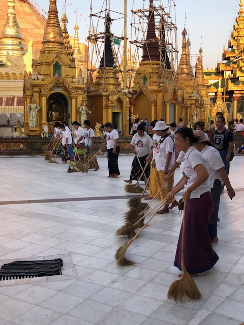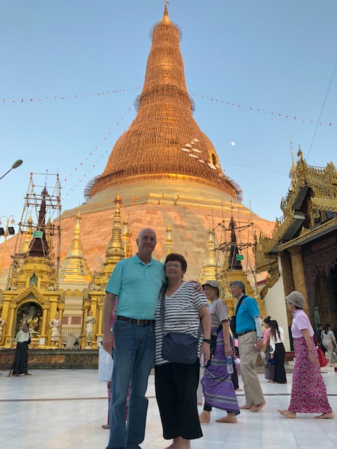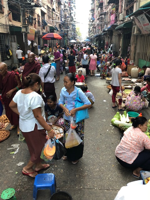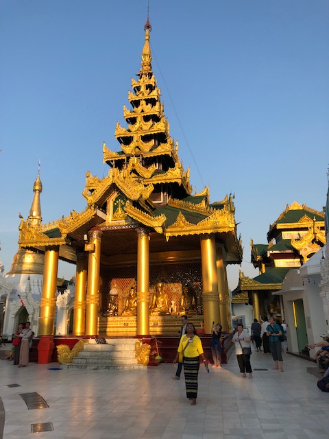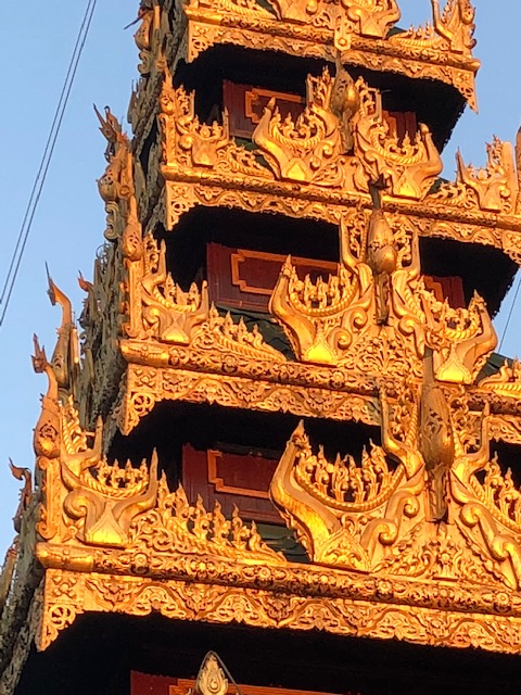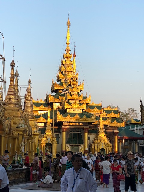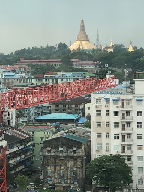 We stayed in Yangon at the Sule Shangri-La, an excellent hotel next to the Sule Pagoda, a beautiful golden stupa within walking distance. The first photo below is from our hotel, but our view isn’t of the Sule Pagoda, it’s the Shwedagon Pagoda, the most famous in Yangon. It’s on a hill, and no other building is supposed to be taller than the Shwedagon. The term “pagoda” was defined a few times by our guides (each time differently), but can mean stupa (solid structure, usually for burial or remains) or temple/shrine (open structure). We added the wedding photo because of two things. Most of the weddings look very Western, and wedding photos are often staged in different hotels or venues before the actual wedding. We saw this throughout Asia. Our Cambodia guide showed us 5 or 6 different outfits for his wedding.