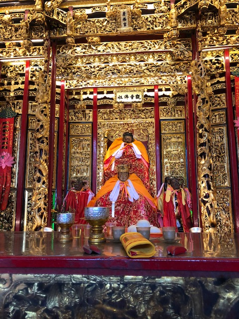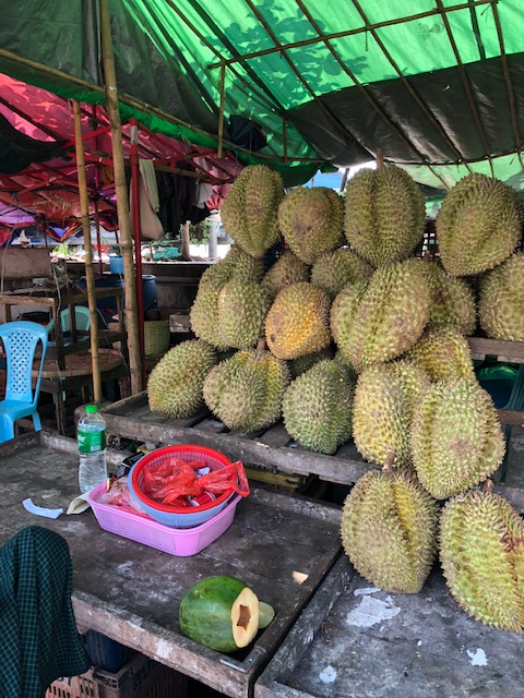 We didn’t do anything the first day, since Tom was recovering from a cough and I was recovering from the heat, but we met our guide, Tin, in the morning to walk through a local market and a Chinese temple The picture of the chicken parts was interesting – there was no part of the chicken that was missing (head, feat, heart, etc.). There were three things immediately different about Yangon from other cities we’ve visited. We saw almost no bikes or motorcycles, but saw thousands of (mainly) white cars (they don’t get dirty as easily). Almost every woman had a very noticeably light pancake makeup in patches on her cheeks and forehead to keep her skin light. Some men did too. Many men, including our guide, wore longhi skirts. Most women wear them too. He says they’re much cooler in the hot weather. Sometimes men wear something under them; sometimes not.