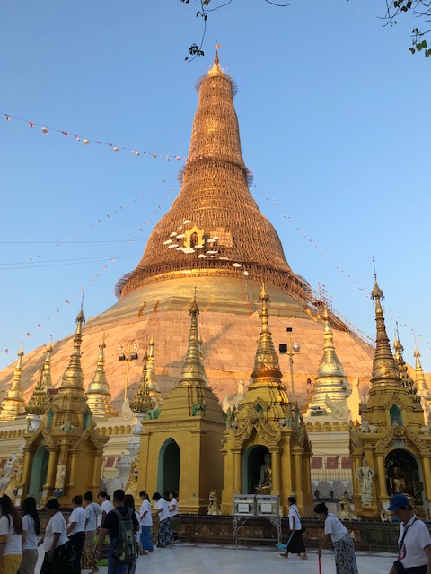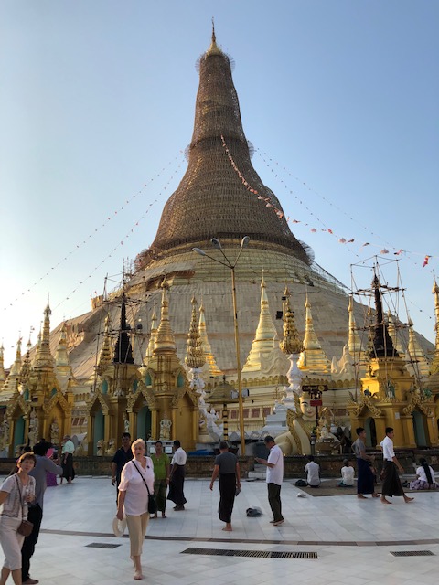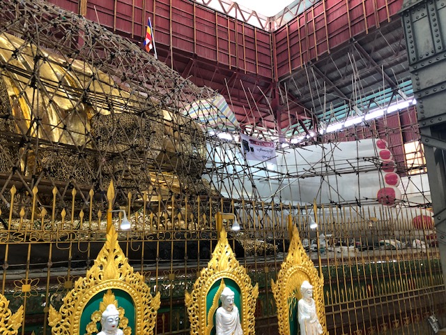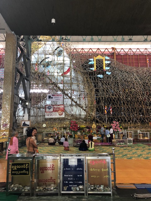 After the market, we walked to the Sule Pagoda, which was quite beautiful with the shiny gold covering, and Tom rang the bell to summon the spirits. I think he summoned the wrong spirits because it went downhill for the rest of the day. The two main sites of Yangon turned out to be under construction. First, we went to the giant reclining Buddha, only to find it being re-gilded, with the first step being painted in black and covered in bamboo scaffolding. You can see they completed the bottom of the feet. That’s me at the end of the feet. Our last stop was Shwedagon Pagoda, the pride of Yangon, but the main spire was under construction and covered with bamboo, so we couldn’t see the gold leaf (or gold tiles) that would be covering it. Did our luck wear out?