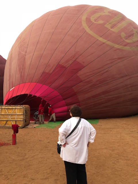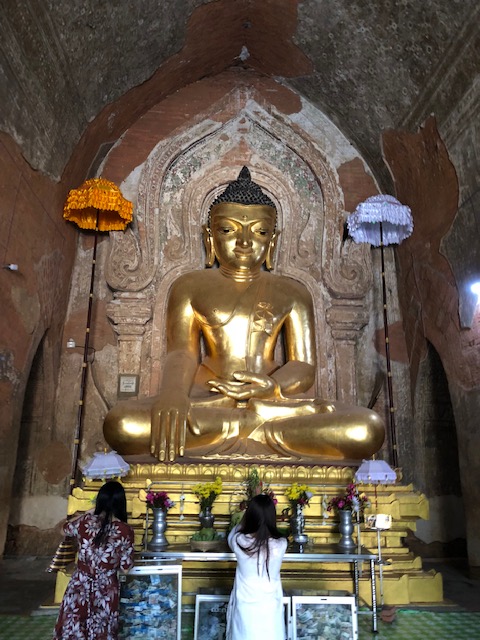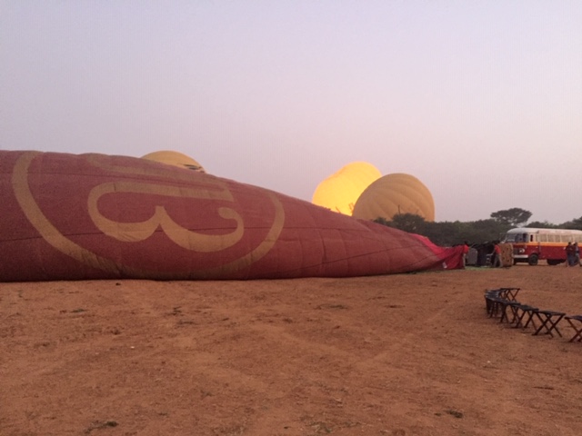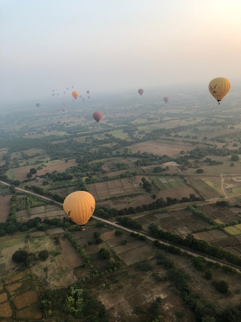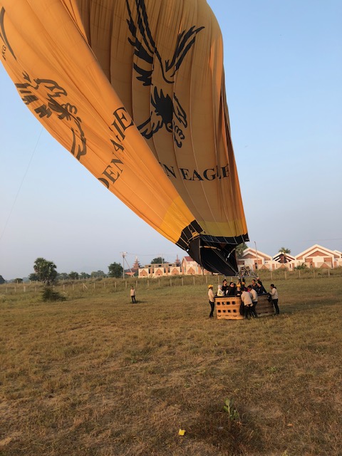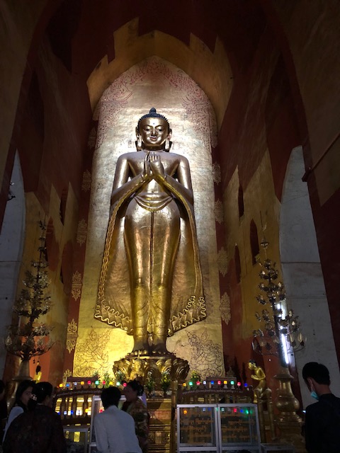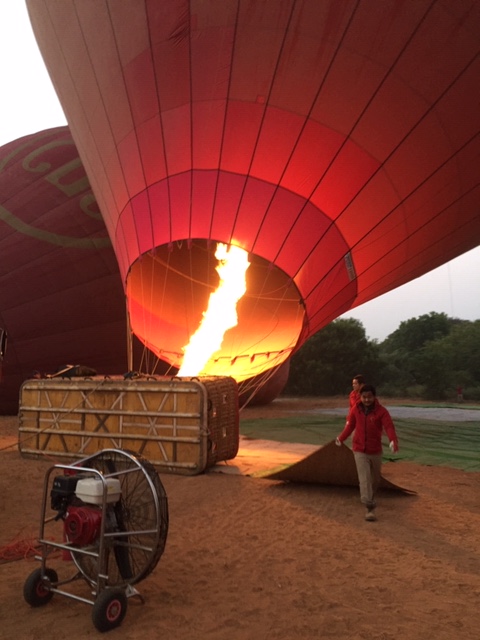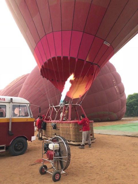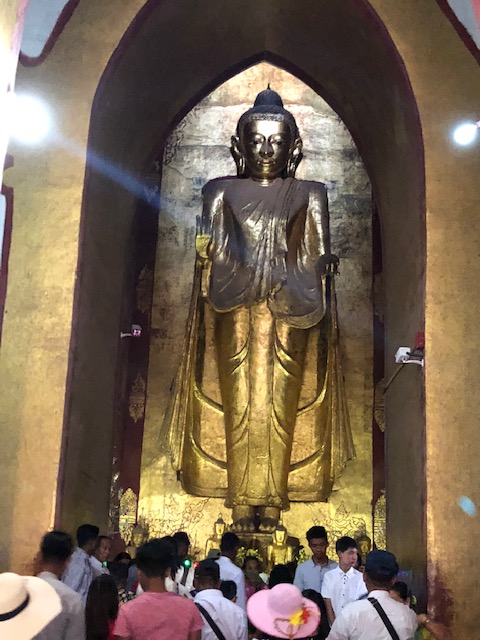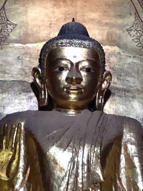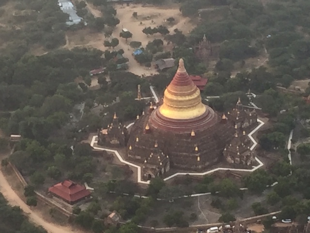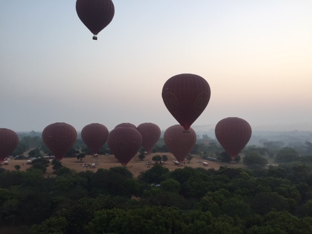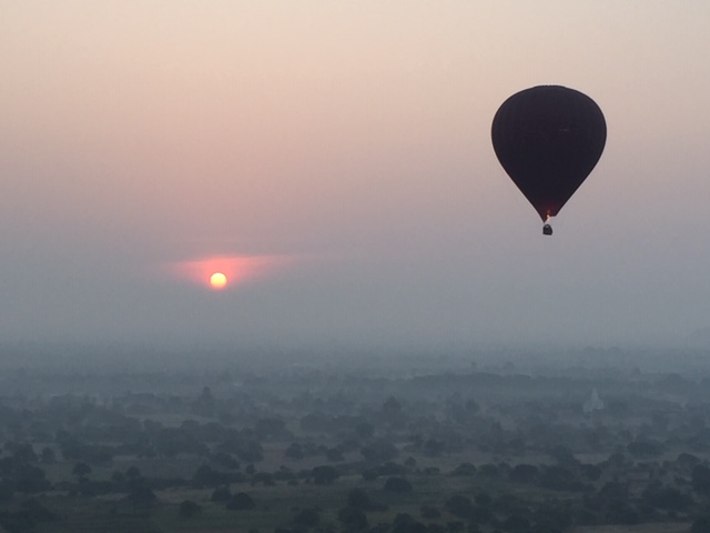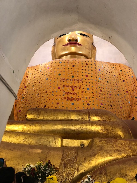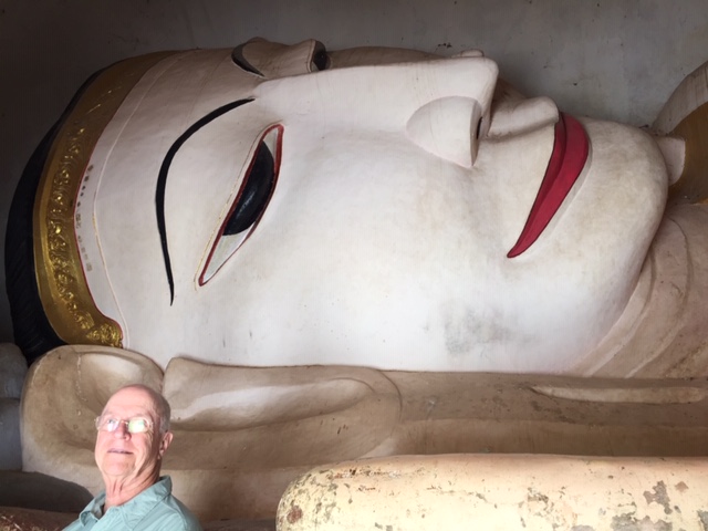 So at 4:15 am, we headed out to see three balloon companies start setting up in the dark. There must have been three dozen balloons altogether, and it was quite a sight. Our group was Balloons Over Bagan, and our pilot and one of the co-owners, Moses, was terrific. It was a magnificent trip, and while a bit expensive, it was worth every penny. It was beautiful to float over the pagodas with the sun coming up and to see the balloons behind and in front of you. Truly a marvelous experience! After breakfast at the hotel, we headed out for more temples, and Bagan has thousands. With only two days, we could only hit the highlights. We first saw the Ananda Temple, with four huge standing Buddhas at each direction, each with different style of faces, hands, necks, ears, hair styles, etc. (they’ve changed over the years and the influences, such as Indian). Then on to Manuha, where the Buddhas are very, very large and the enclosures are built around them, so you can barely see the entire figure. One more temple (can’t remember) before a sunset cruise on our own boat on the Ayeyarwaddy River. I’m loving this way to travel!