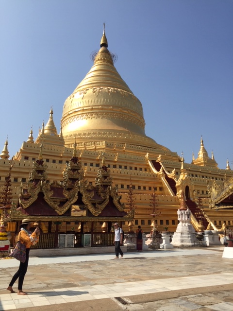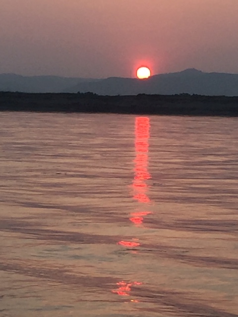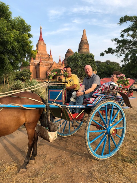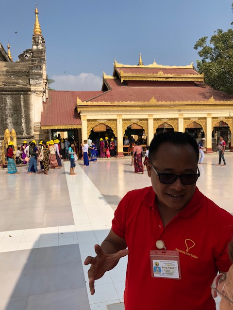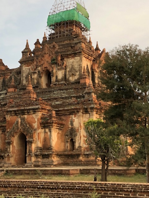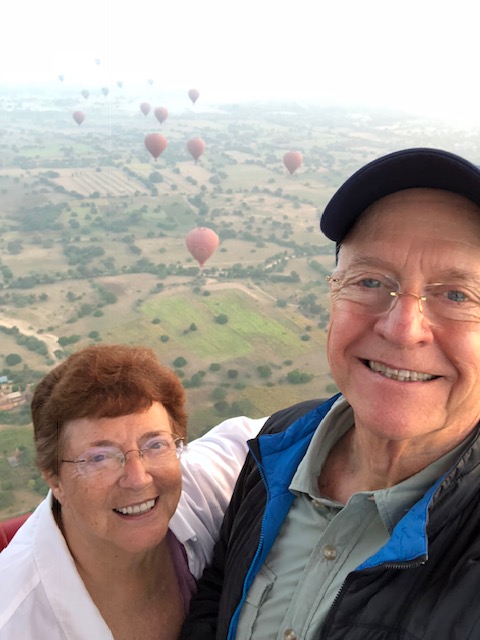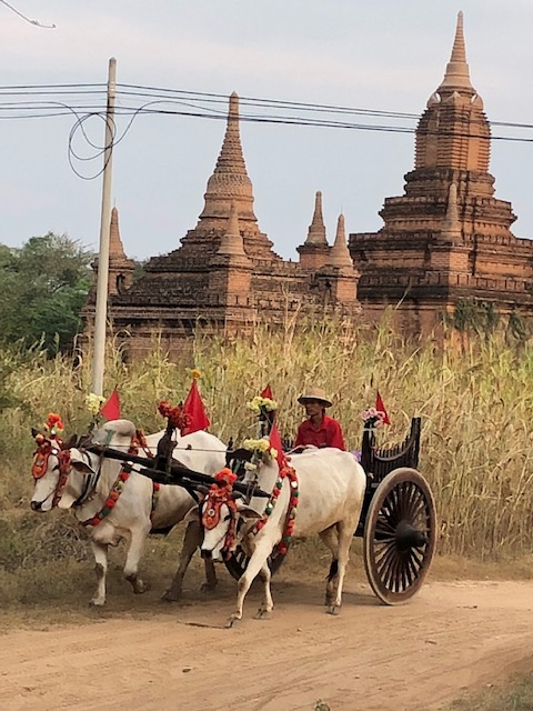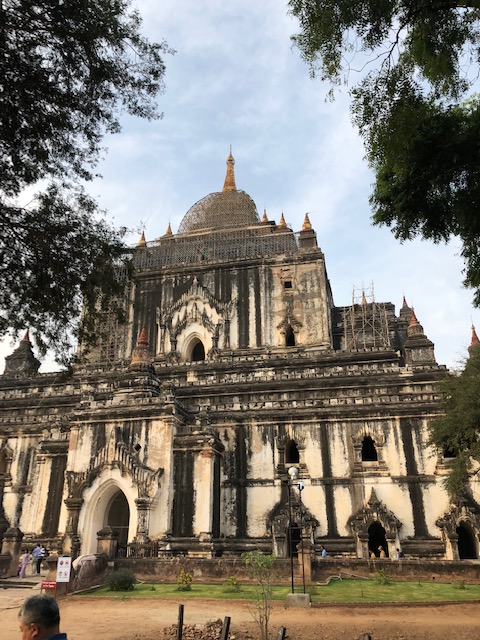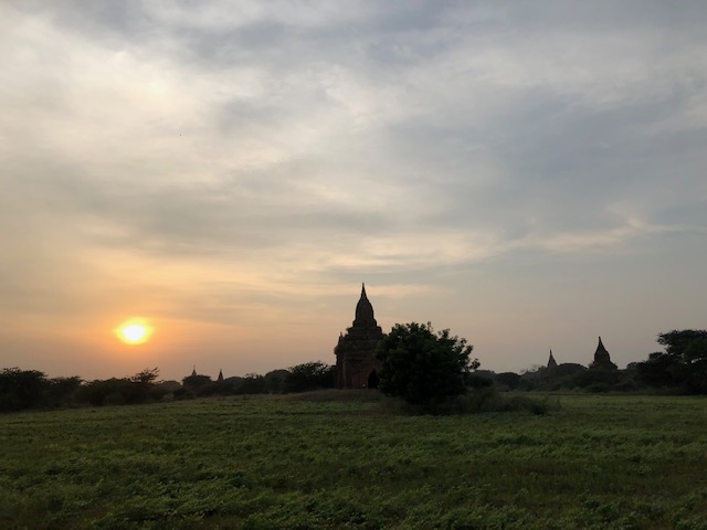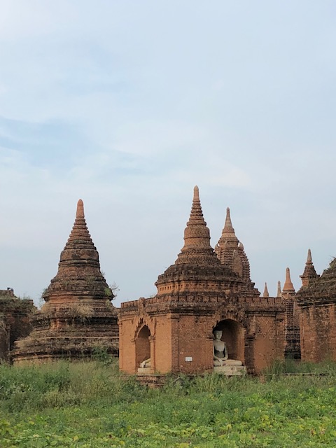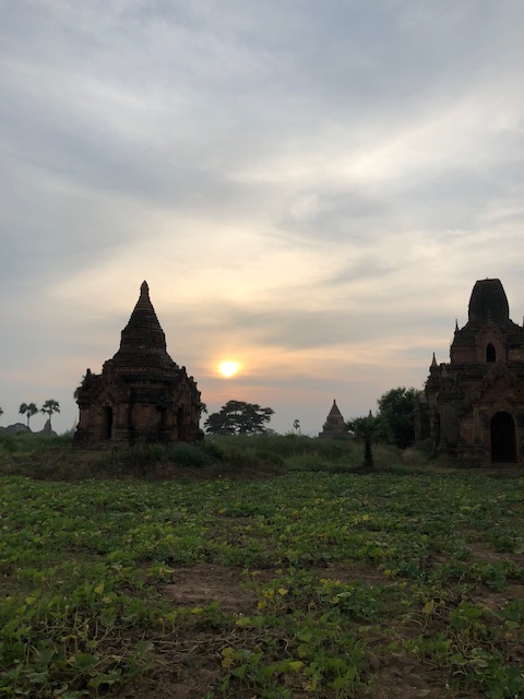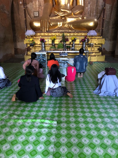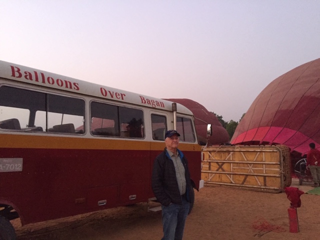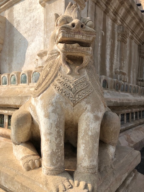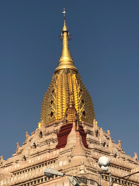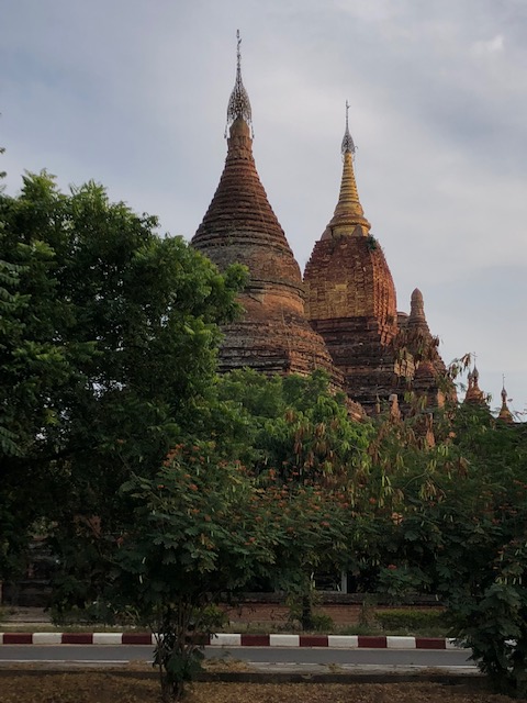 So at 4:15 am, we headed out to see three balloon companies start setting up in the dark. There must have been three dozen balloons altogether, and it was quite a sight. Our group was Balloons Over Bagan, and our pilot and one of the co-owners, Moses, was terrific. It was a magnificent trip, and while a bit expensive, it was worth every penny. It was beautiful to float over the pagodas with the sun coming up and to see the balloons behind and in front of you. Truly a marvelous experience! After breakfast at the hotel, we headed out for more temples, and Bagan has thousands. With only two days, we could only hit the highlights. We first saw the Ananda Temple, with four huge standing Buddhas at each direction, each with different style of faces, hands, necks, ears, hair styles, etc. (they’ve changed over the years and the influences, such as Indian). Then on to Manuha, where the Buddhas are very, very large and the enclosures are built around them, so you can barely see the entire figure. One more temple (can’t remember) before a sunset cruise on our own boat on the Ayeyarwaddy River. I’m loving this way to travel!