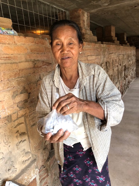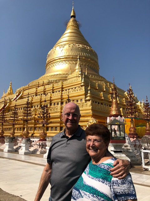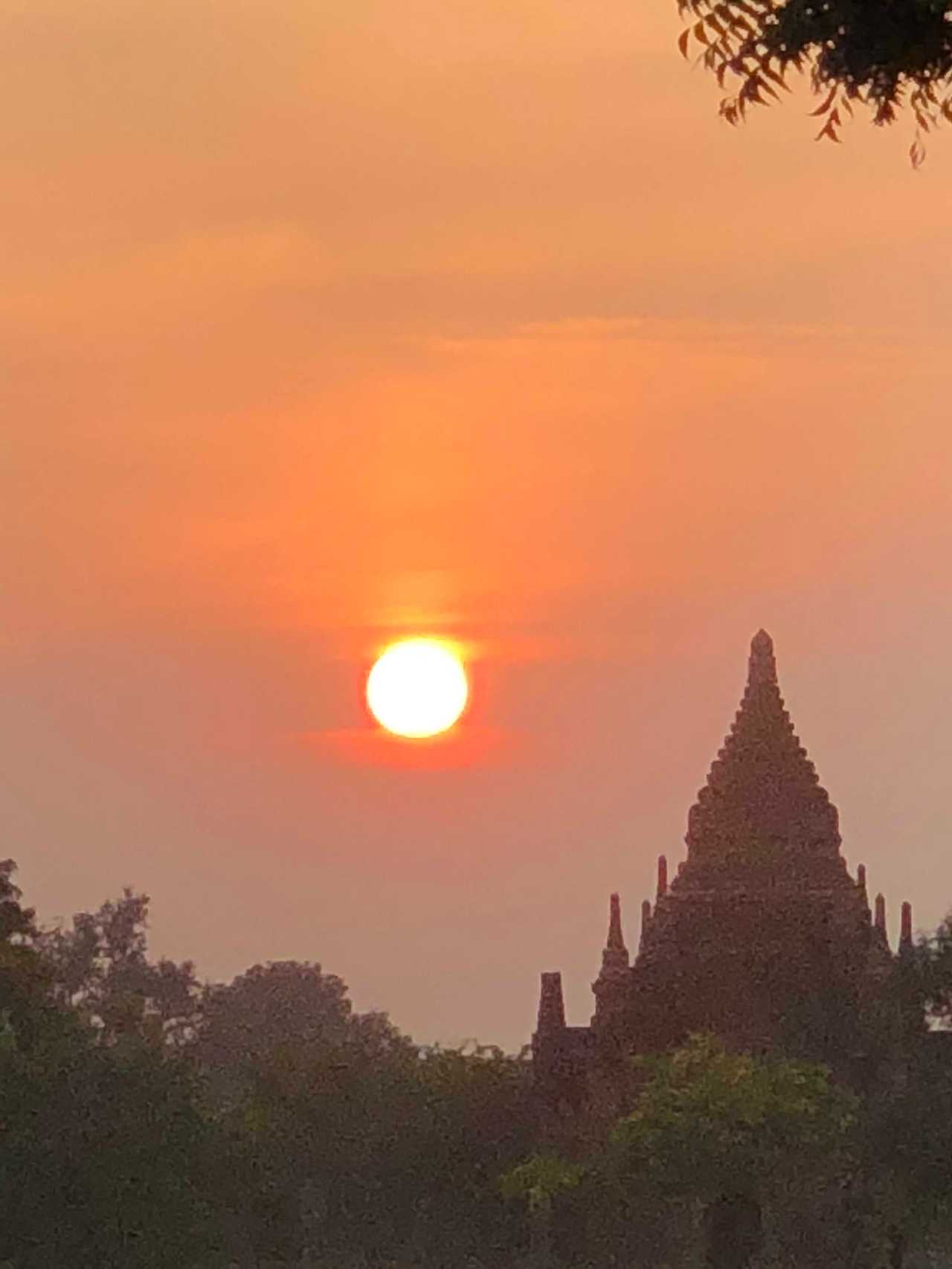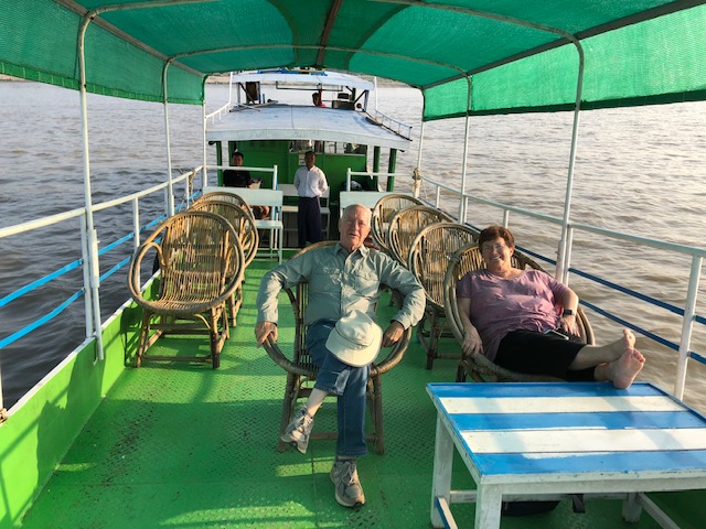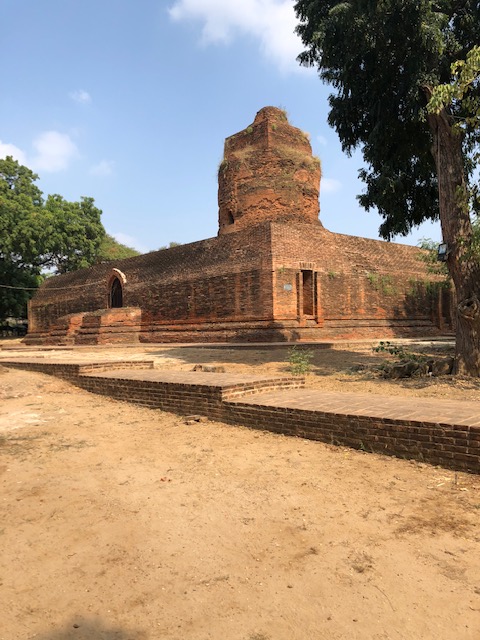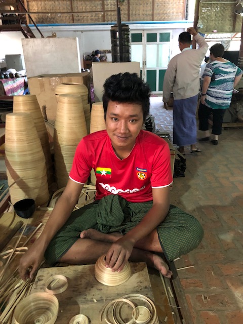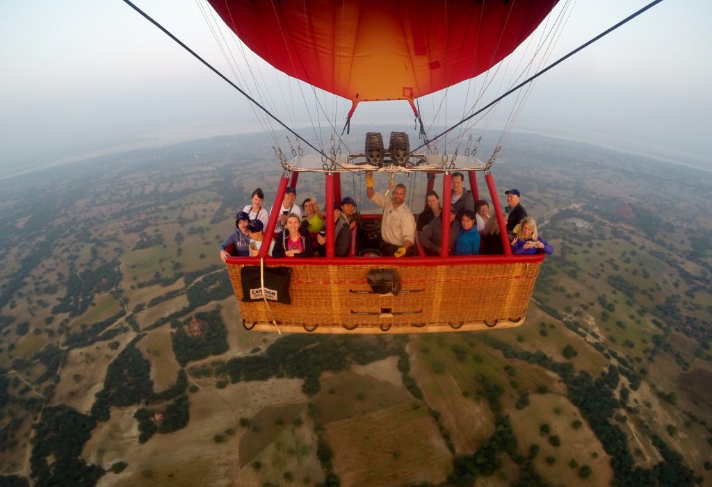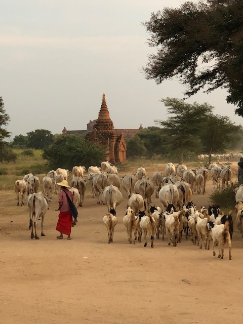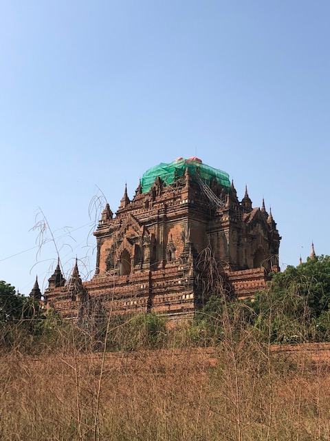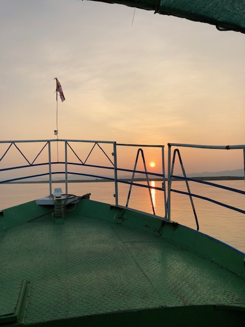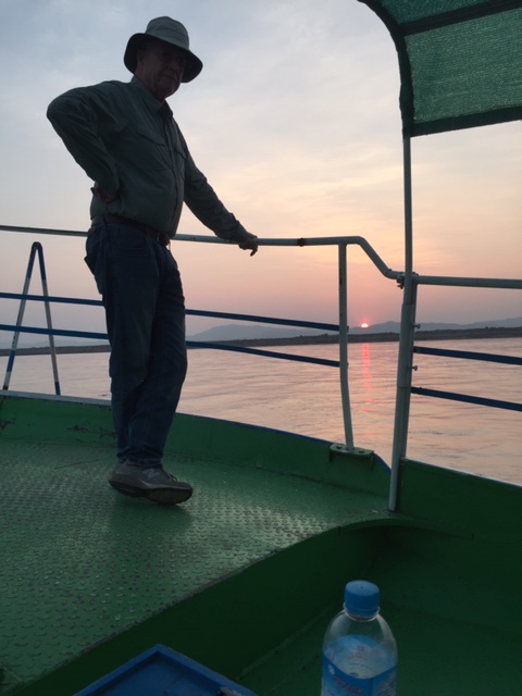 So at 4:15 am, we headed out to see three balloon companies start setting up in the dark. There must have been three dozen balloons altogether, and it was quite a sight. Our group was Balloons Over Bagan, and our pilot and one of the co-owners, Moses, was terrific. It was a magnificent trip, and while a bit expensive, it was worth every penny. It was beautiful to float over the pagodas with the sun coming up and to see the balloons behind and in front of you. Truly a marvelous experience! After breakfast at the hotel, we headed out for more temples, and Bagan has thousands. With only two days, we could only hit the highlights. We first saw the Ananda Temple, with four huge standing Buddhas at each direction, each with different style of faces, hands, necks, ears, hair styles, etc. (they’ve changed over the years and the influences, such as Indian). Then on to Manuha, where the Buddhas are very, very large and the enclosures are built around them, so you can barely see the entire figure. One more temple (can’t remember) before a sunset cruise on our own boat on the Ayeyarwaddy River. I’m loving this way to travel!