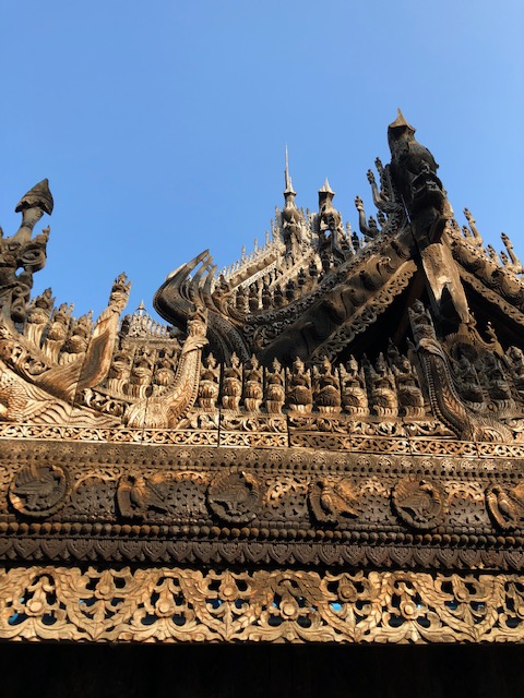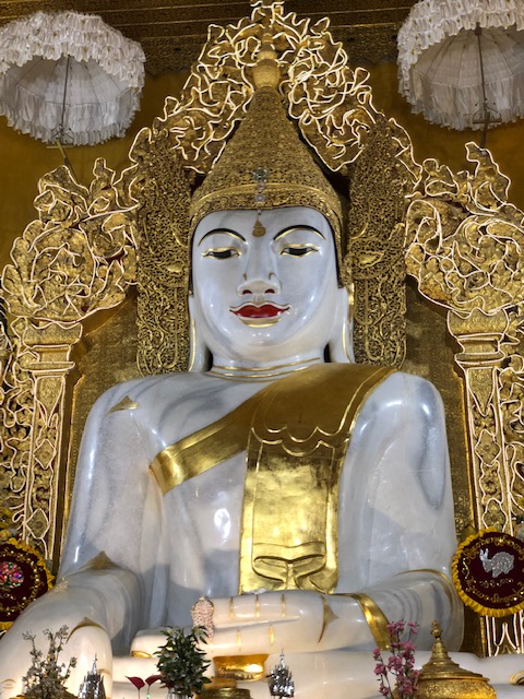 After lunch, we headed to our hotel to check in and found that we had the best room in the Hilton – top floor with our balcony directly looking at Mandalay Hill. Gorgeous! From there, we visited the Old Palace grounds, then the Golden Palace Monastery with its wood carvings. Then it was up to Mandalay Hill with its Sutaungpyei complex of temples and stupas and tourists. It was planned for us to go at sunset, but not enjoying crowds made up opt for an earlier excursion. On to Kyauktawgyi Pagoda where the huge Buddha is carved out of a single block of marble, and then finally to one of the largest complexes of all – the Kuthodaw Pagoda, which has 729 slabs inscribed with books of the Buddha’s doctrine.