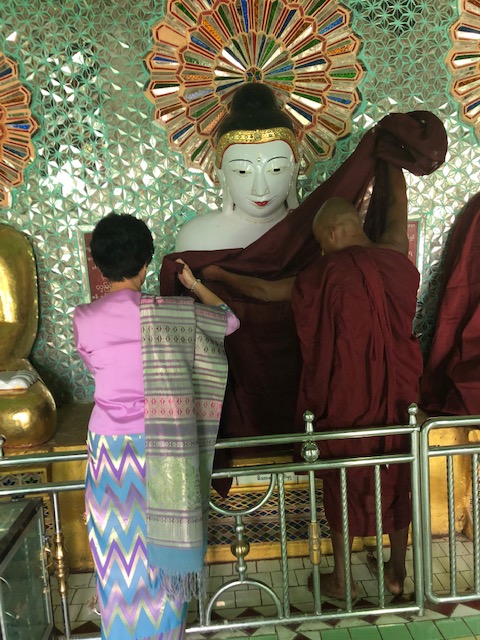 Our flight on Mann Yadanapon Airlines departed Bagan for Mandalay at 8:35 am. I wonder what a vacation would be like without 6 am alarm calls. Our guide in Mandalay was a delightful woman by the name of Thanda, who first took us to the large Mahanumi temple. The photos of shaved women in pink robes are nuns or nun officiates. We’ve been seeing lots of monks of all ages throughout Myanmar, but few women until now. The country is 90-95% Buddhist, and most males becomes monks at some point in their life for a few weeks or months. This can occur even after they’ve married and had children. They are fed a meal in the monastery in the morning and then they have to go ask for food, but only until noon. For some kids, the monastery is the only education they might get if there are no schools available.