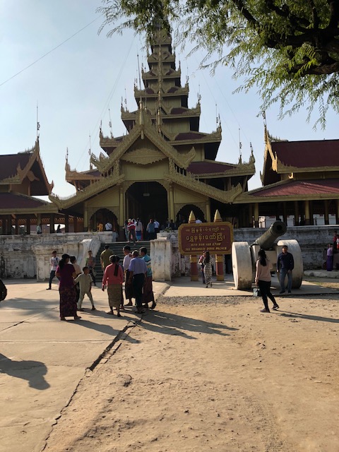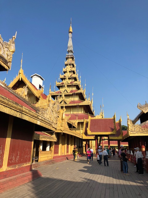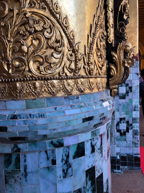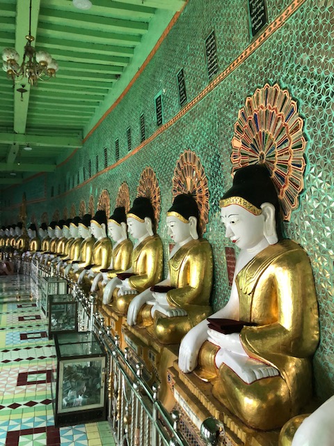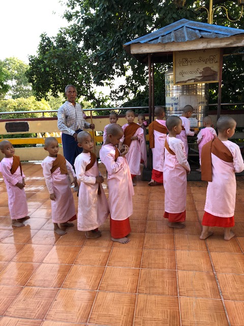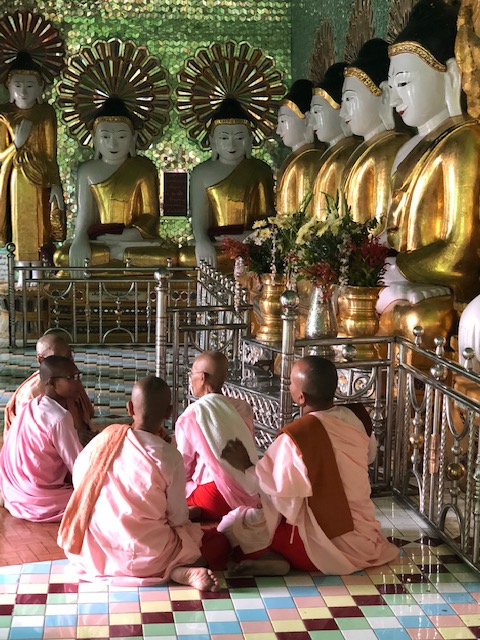 Our flight on Mann Yadanapon Airlines departed Bagan for Mandalay at 8:35 am. I wonder what a vacation would be like without 6 am alarm calls. Our guide in Mandalay was a delightful woman by the name of Thanda, who first took us to the large Mahanumi temple. The photos of shaved women in pink robes are nuns or nun officiates. We’ve been seeing lots of monks of all ages throughout Myanmar, but few women until now. The country is 90-95% Buddhist, and most males becomes monks at some point in their life for a few weeks or months. This can occur even after they’ve married and had children. They are fed a meal in the monastery in the morning and then they have to go ask for food, but only until noon. For some kids, the monastery is the only education they might get if there are no schools available.