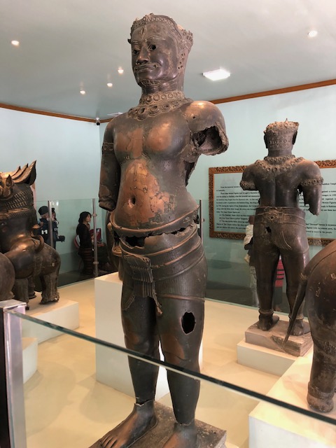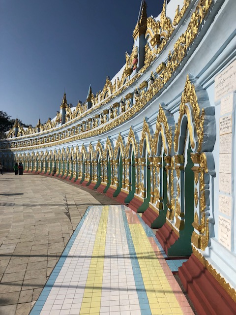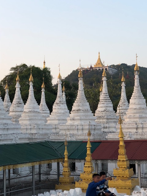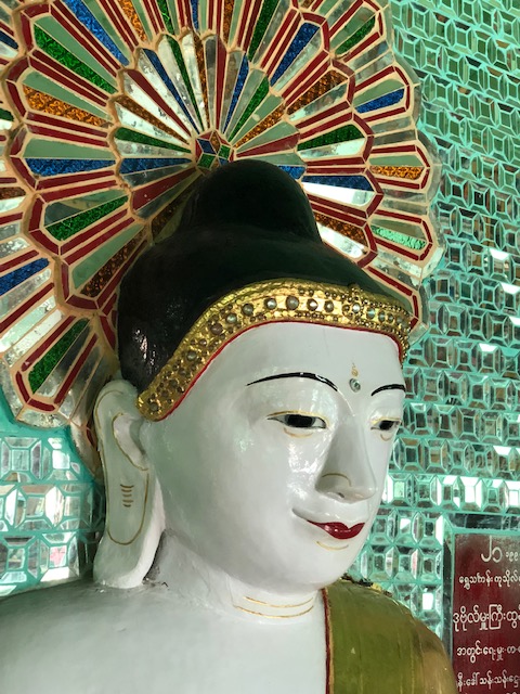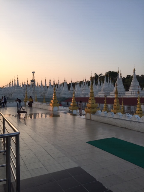 After lunch, we headed to our hotel to check in and found that we had the best room in the Hilton – top floor with our balcony directly looking at Mandalay Hill. Gorgeous! From there, we visited the Old Palace grounds, then the Golden Palace Monastery with its wood carvings. Then it was up to Mandalay Hill with its Sutaungpyei complex of temples and stupas and tourists. It was planned for us to go at sunset, but not enjoying crowds made up opt for an earlier excursion. On to Kyauktawgyi Pagoda where the huge Buddha is carved out of a single block of marble, and then finally to one of the largest complexes of all – the Kuthodaw Pagoda, which has 729 slabs inscribed with books of the Buddha’s doctrine.