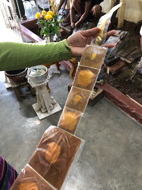 After the temple, we went to a gold leaf making place where three workers were pounding the gold nuggets into gold leaf. The hammers were very heavy and they pounded interwoven stacks of gold and bamboo paper for hours until the gold was thin enough. This is the gold that they use for enamelware and covering Buddhas and religious structures.