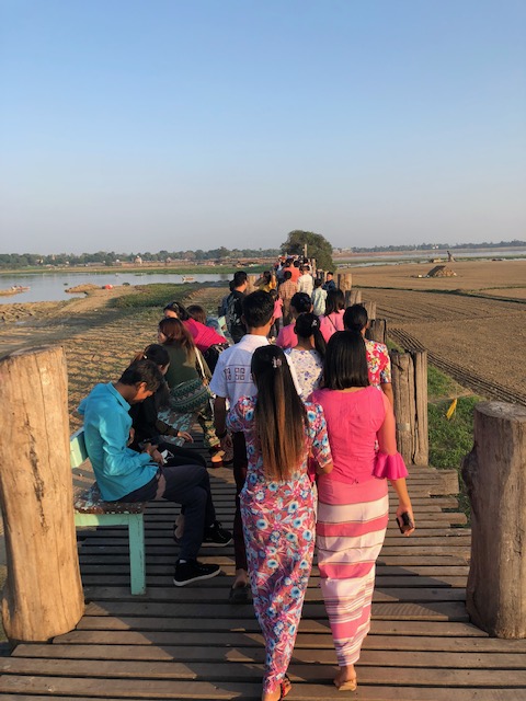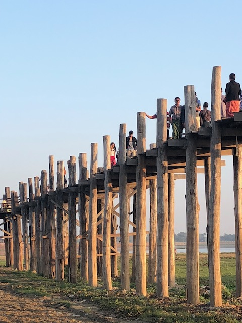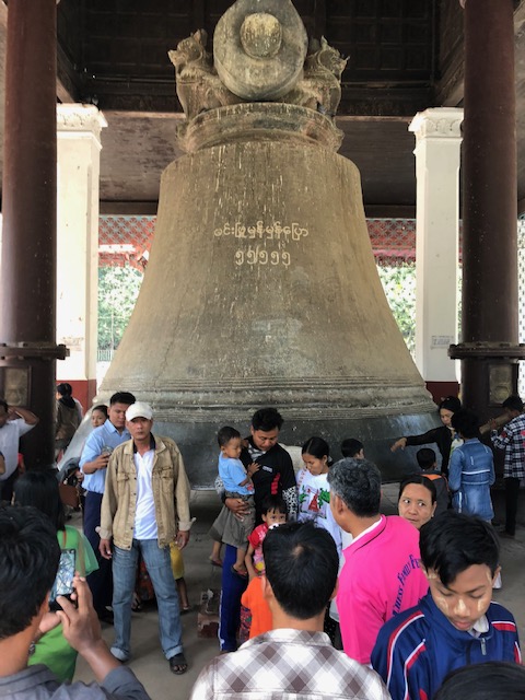The next morning, we started by visiting Thanda’s home and meeting her parents, two sisters, and her son. He is really a cutie! Then it was an hour-long boat ride to Mingun, a village on the other side of the river with a huge unfinished Phatodawgyi Pagoda and the Mingun bell. At 90 tons, it’s the largest ringing bell in the world. I had to skip the rest of the day because of the heat, but Tom kept on sightseeing. (He’s pretty amazing, even with a cold/cough.) The next stop was Sagaing Hill with 600 white-washed pagodas and monasteries. The two main pagodas were the U-Min-Thonw-Sae and Soon-Oo-Pon-Nya-Shin Pagodas where they were adding robes to the Buddha images. The final stop was a 200 year-old bridge in Amarapura called the U Bein bridge.
