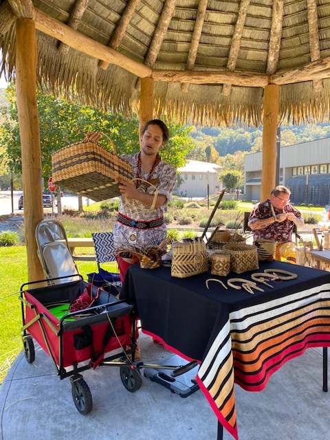 After packing up, we headed to the Museum of the Cherokee Indian in Cherokee, NC. The museum was quite well done, but we think their coverage of the “Trail of Tears” was far too kind to the government and white settlers who expelled them from a beautiful country of mountains, streams, plentiful animals and land for planting to the lands of Oklahoma, which provided none of that. The Native Americans got screwed! It’s appalling. The most interesting part of the museum was a display by an artist (Dilani Morgan) who really likes the craft of basket weaving. He had some amazing pieces and explained exactly how they are made.