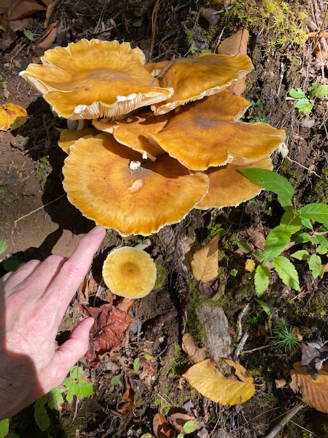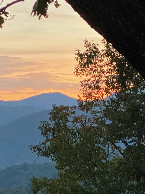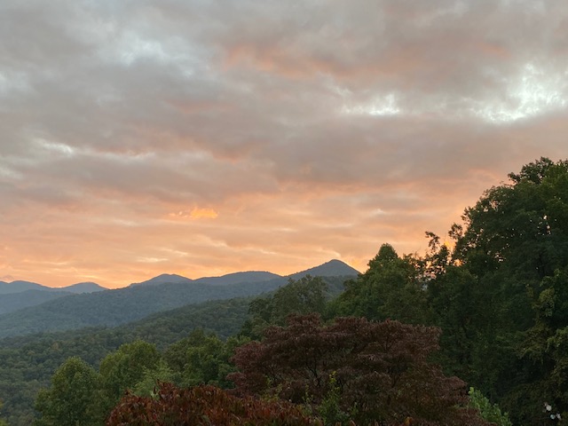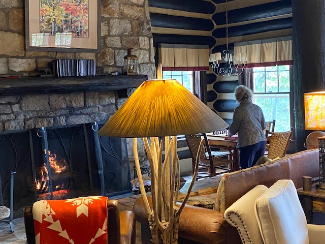 A couple of people had recommended Snowbird Mountain Lodge, which was booked for the season. On a whim, we called and found a 4-day cancellation. The lodge is just off the Blue Ridge Parkway. We had rented a car in Asheville and had a spectacular drive along and beside the Parkway. The entrance to the lodge property say “You are now entering a stress free zone.” There is a main lodge with rooms, sitting/viewing areas, and a restaurant, plus three guest properties. We’re in the Oak room of the Chestnut cottage, which is right next to a Tesla and other EV chargers. The lodge provides two gourmet meals a day, a day pack with your pre-ordered lunch, tennis courts, free canoes and kayaks, free fishing equipment, lots and lots of mountain trails, fire pits, and fantastic views of the Snowbird Mountains.