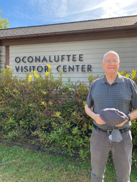 But first we flew to Asheville to see our (Tom’s) son, Jeff, who is an app developer and just developed a new board game. It was really great to see him again, his mother Elaine and her husband Bruce. That day a Facebook friend of Tom’s heard we were here and suggested we stop at the Oconoluftee Indian museum. It was an hour and a half very winding drive through tiny towns that Tom says reminded him of his childhood. (They haven’t changed a bit.) There were Autumn displays with pumpkins and scarecrows in almost every town.