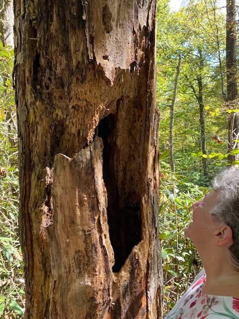 We’re really enjoying the peace and quiet here. We had cleared our schedule before we came, so we just read, nap, and hike. On Thursday, we went to the Joyce Kilmer Memorial Forest to see the only area that wasn’t clear cut by the loggers. It started with 3800 acres, but has grown. It has 100 kinds of trees that are centuries old (the two largest poplars are over 20′ in circumference), and one of the few places where you can see such a variety – 1400 flowering plants, 600 mosses, liverworts and lichen, and over 2000 kinds of fungi, 20 species of snakes, 52 kinds of mammals (including black bears), 200 species of birds, and 20 types of fish. The first photo below shows a tree that appears to be totally decayed at the bottom, but is thriving 100 feet up. The second photo is two trees that grew together. The third photo with Tom shows the largest tree we encountered before turning back. We hiked for only 2 miles, but gained 490 feet in elevation – that’s over 40 flights of stairs!